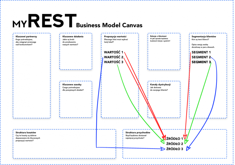 Lista źródeł przychodów, połączonych z klientami i propozycjami wartości.